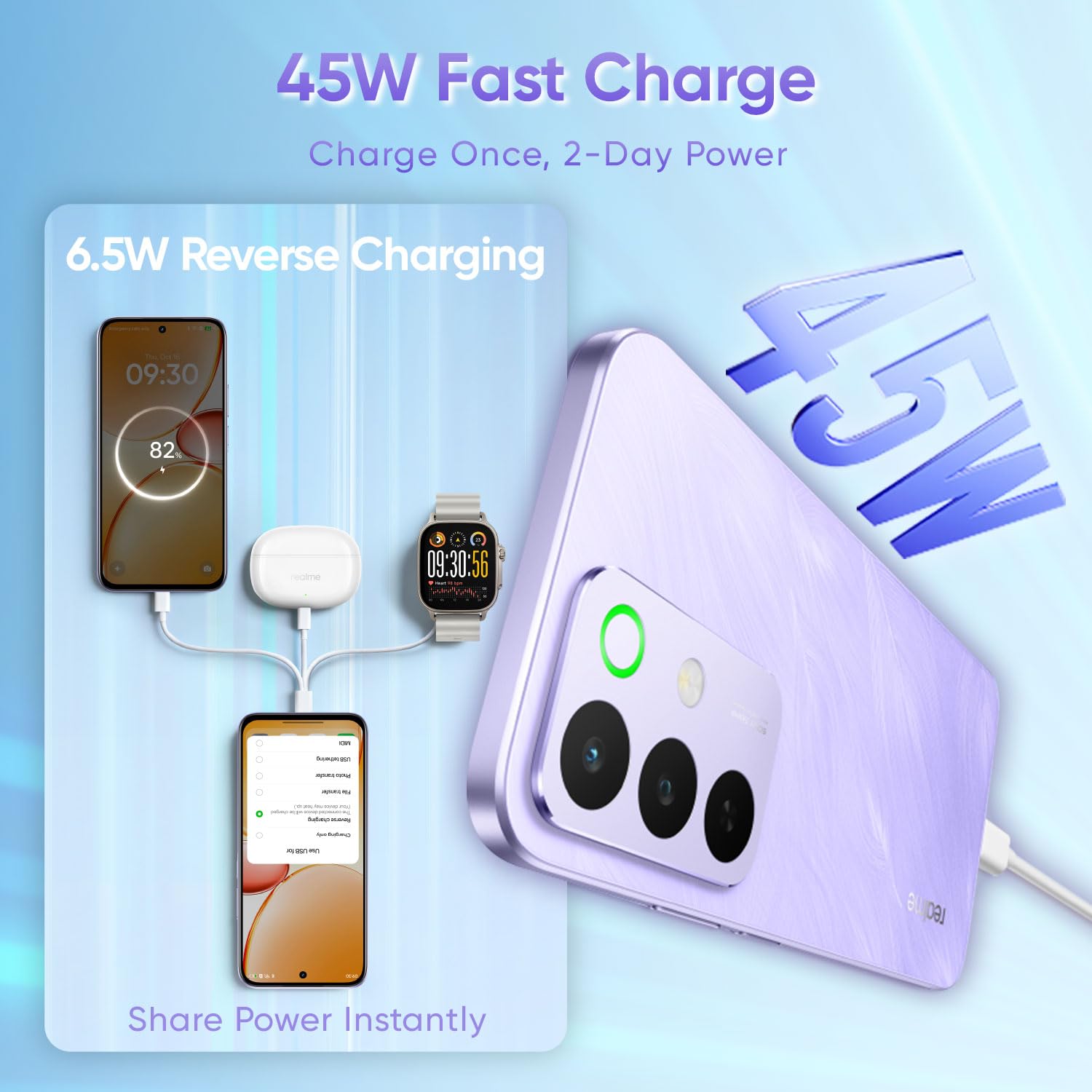 • 45W fast charging support via USB Type-C for quick top-ups before you step out.