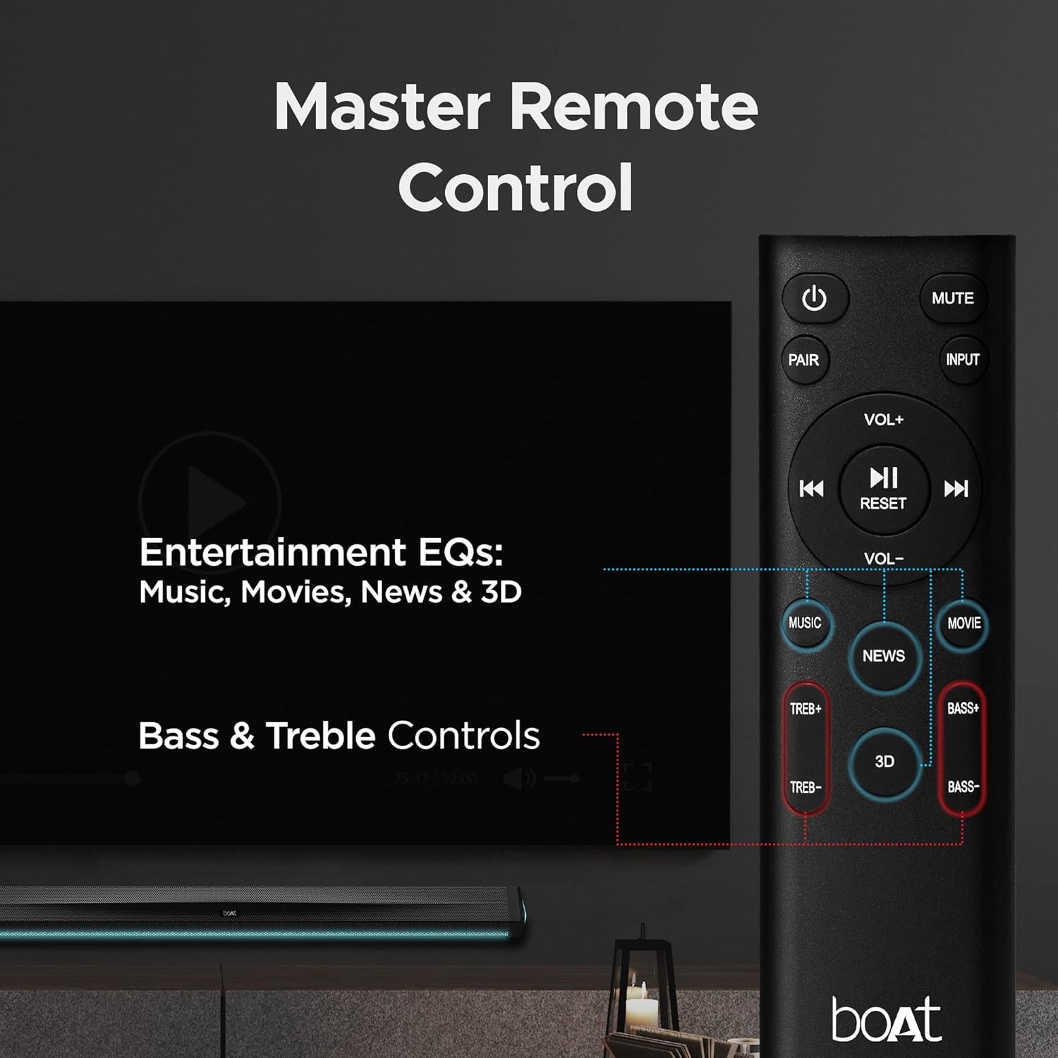 The boAt Aavante Bar Stark 2.1 Bluetooth Soundbar delivers powerful sound in a compact design with a 160W output and dedicated subwoofer. Built to enhance movies, music, gaming, and TV audio, it offers punchy bass, clear vocals, and seamless wireless connectivity for an immersive home entertainment experience.