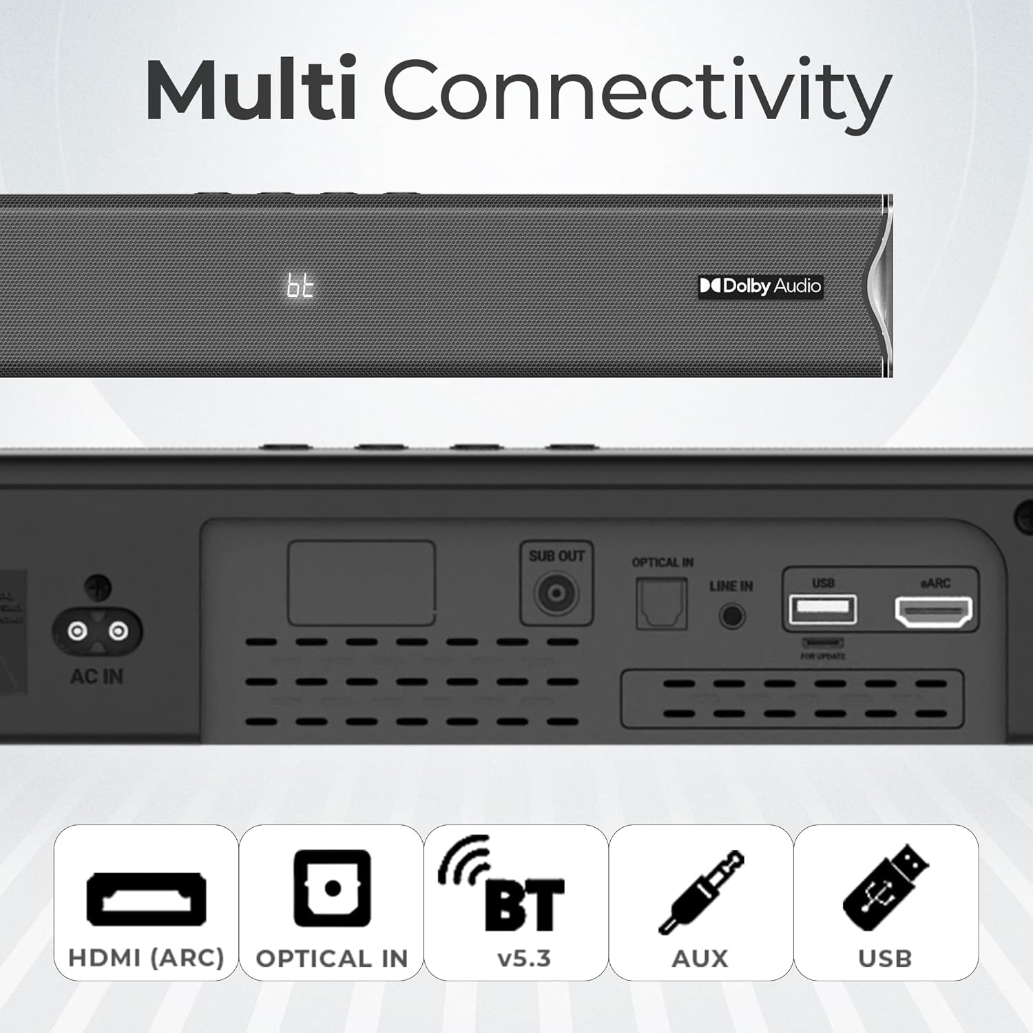 | Connectivity | Bluetooth, HDMI ARC, USB, Optical, AUX |