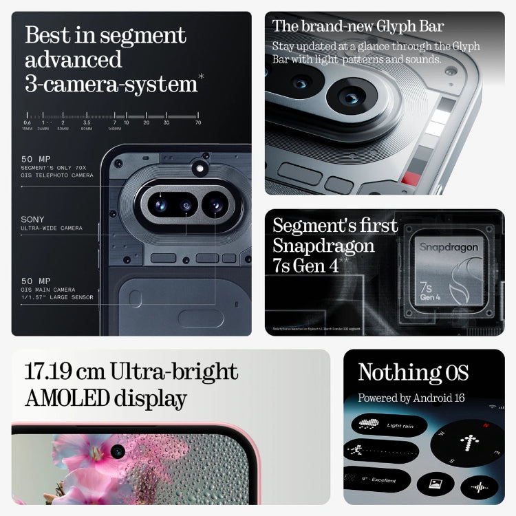 Glyph Bar Interface Snapdragon 7s Gen 4 50MP Triple Camera 1.5K AMOLED 120Hz 5400mAh Battery 50W Fast Charging Nothing OS IP64 Protection