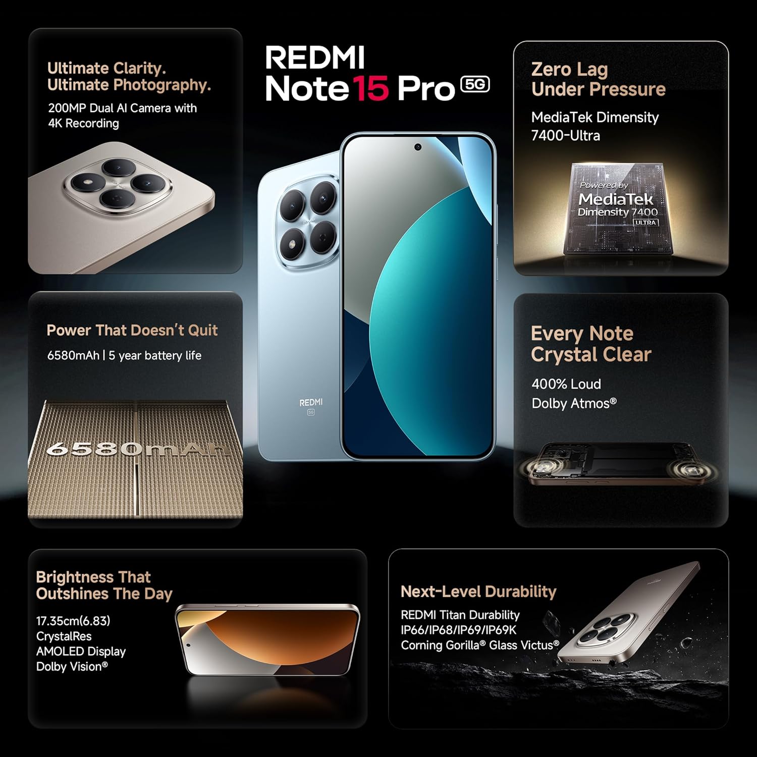 The Redmi Note 15 Pro 5G sets a new standard for mid-range flagships with its 200MP MasterPixel camera, ultra-durable Titan Structure, and a massive 6580mAh battery. Designed for performance and longevity, it features a stunning 1.5K CrystalRes AMOLED display and flagship-grade IP69K water resistance.