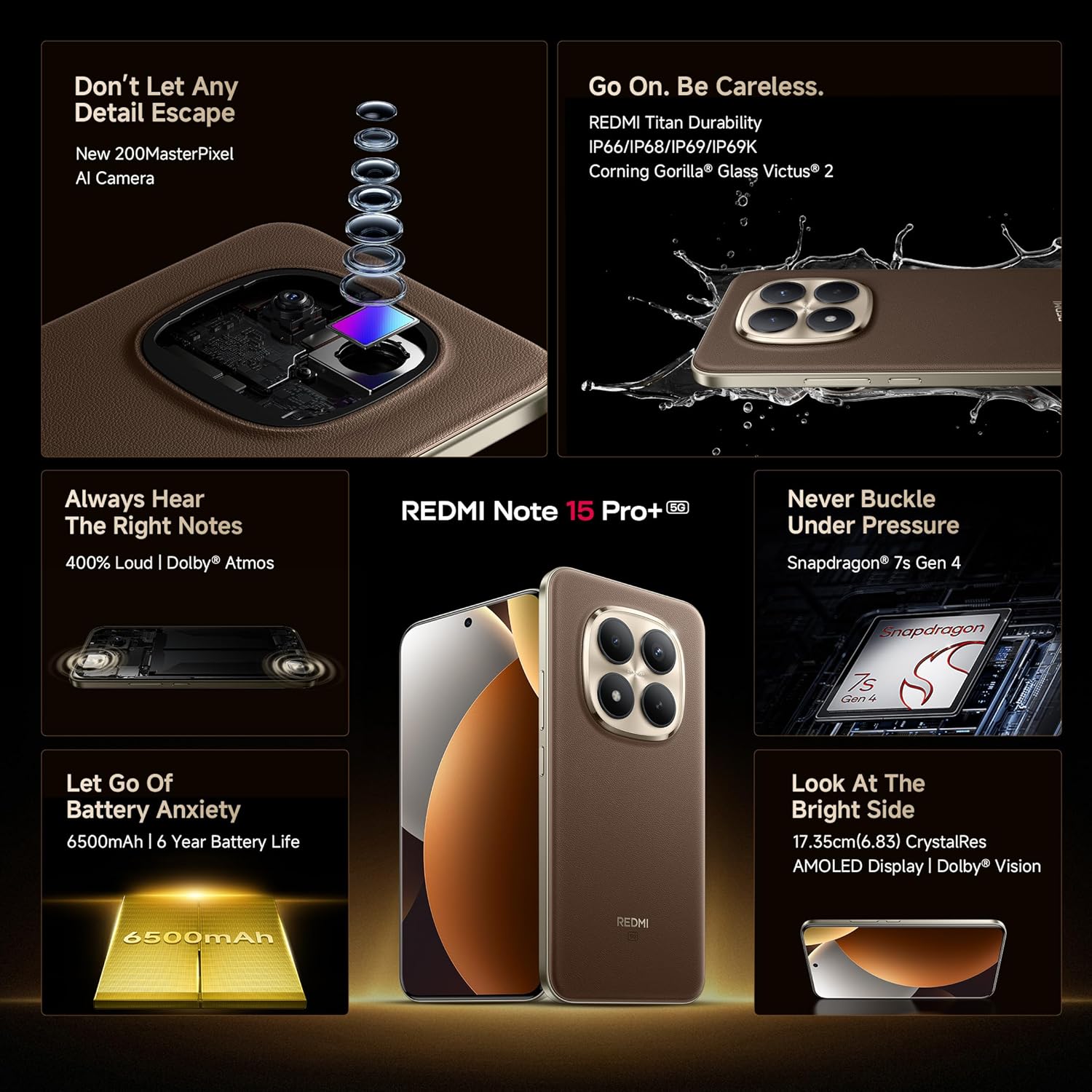 The Redmi Note 15 Pro+ 5G is the ultimate performance flagship in the Note series. It combines a professional-grade 200MP camera system with ultra-fast 100W HyperCharge technology and the powerful Snapdragon 7s Gen 4 chipset, all wrapped in a premium Titan Structure for unmatched durability.